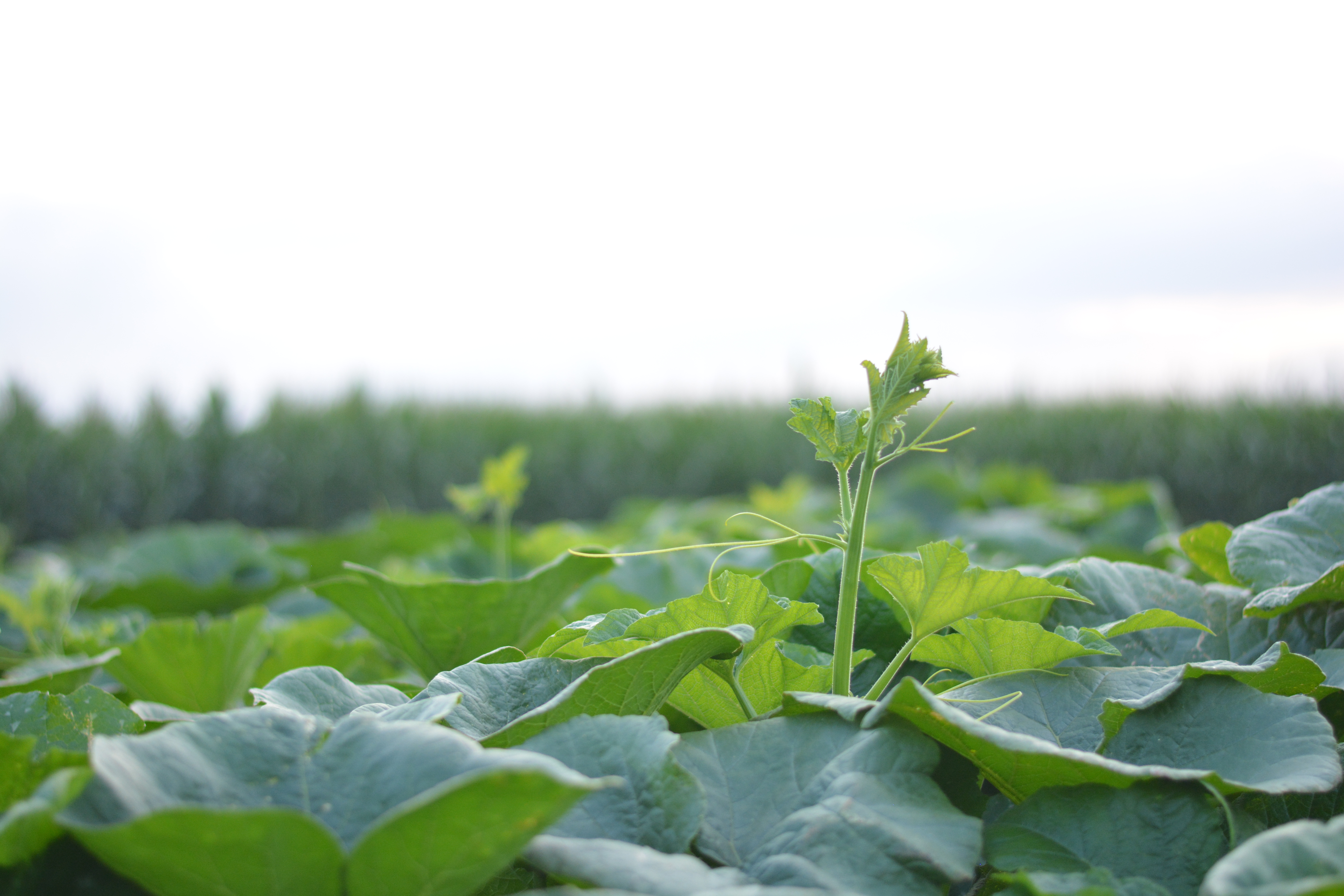 Begin mei zaaien we de pompoenpitten zorgvuldig in onze kas. Zodra het half mei is, planten we de jonge planten met onze speciale plantmachine op het land.